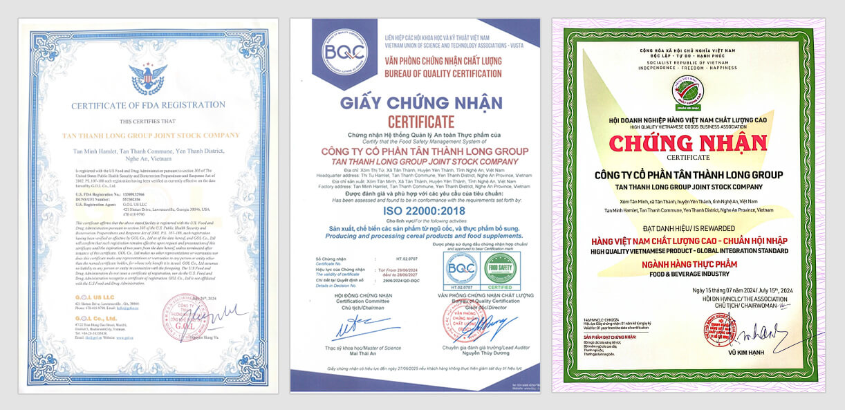 • Chứng nhận FDA (Hoa Kỳ): Sản phẩm đã đáp ứng các tiêu chuẩn khắt khe của Cục Quản lý Thực phẩm và Dược phẩm Hoa Kỳ. Đây là "giấy thông hành" khẳng định chất lượng vượt trội, đủ tiêu chuẩn để xuất khẩu và lưu hành tại các thị trường khó tính nhất.