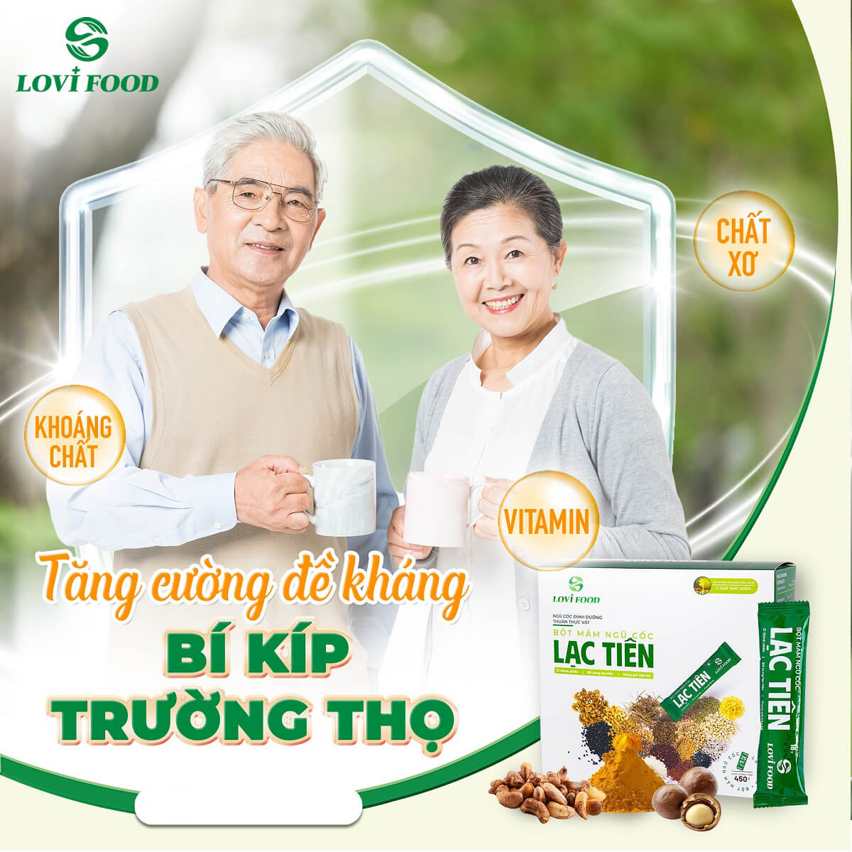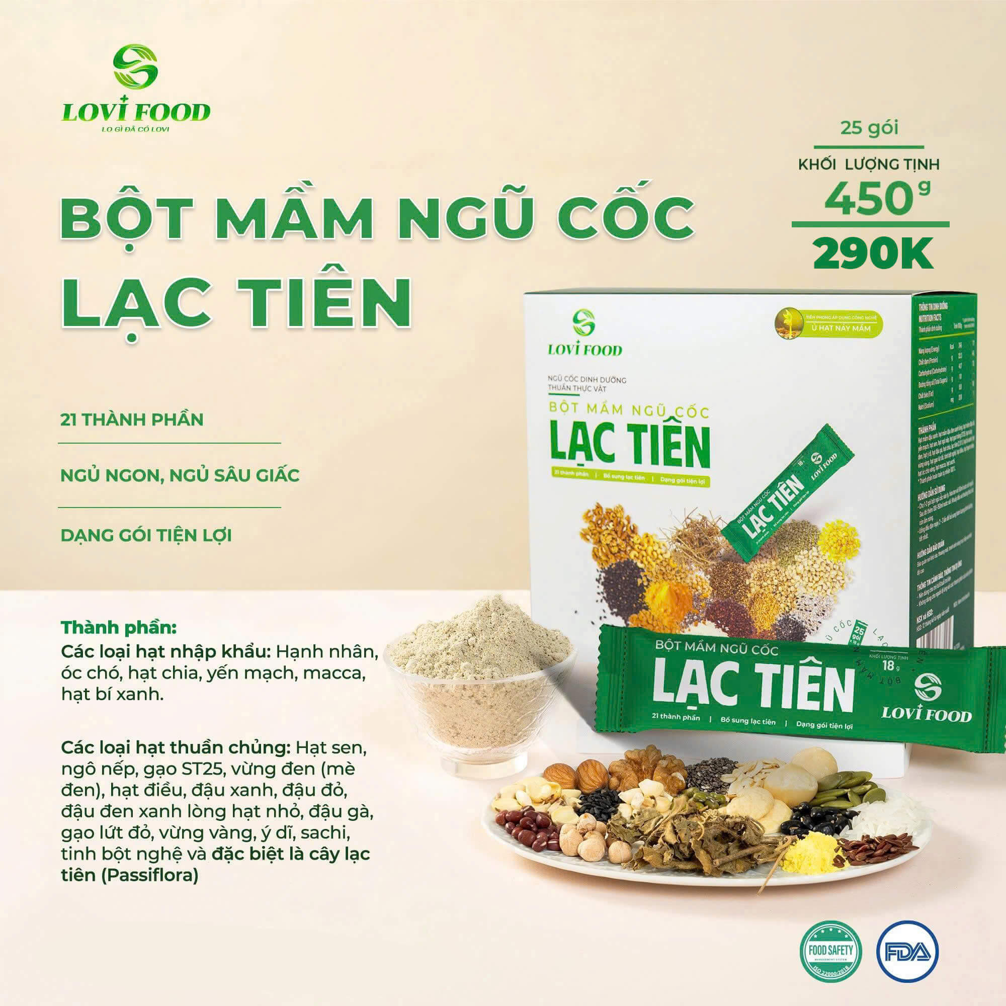 Bột Mầm Ngũ Cốc Lạc Tiên Lovifood là sự kết hợp tinh túy từ các loại hạt nhập khẩu: Hạnh nhân, óc chó, hạt chia, yến mạch, macca, hạt bí xanh.Các loại hạt thuần chủng: Hạt sen, ngô nếp, gạo ST25, vừng đen (mè đen), hạt điều, đậu xanh, đậu đỏ, đậu đen xanh lòng hạt nhỏ, đậu gà, gạo lứt đỏ, vừng vàng, ý dĩ, sachi, tinh bột nghệ và đặc biệt là cây lạc tiên (Passiflora).